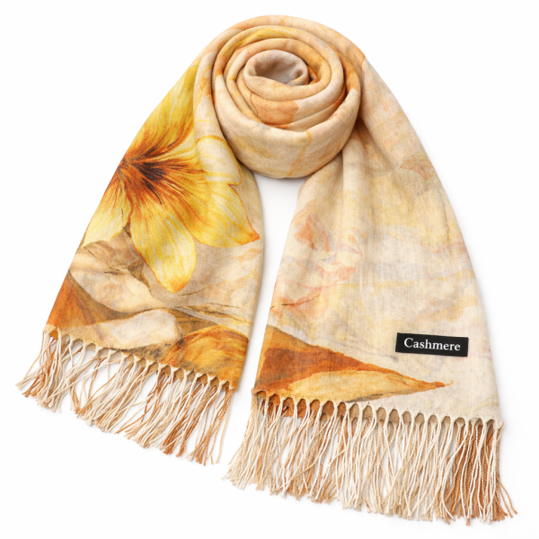 Кашмирен дамски шал с цветя в бежово и ресни