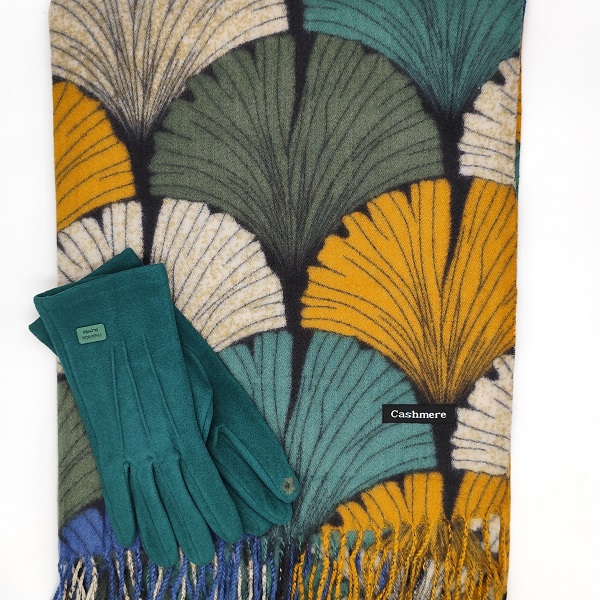 Шал и ръкавици – елегантен комплект в зелено и горчица, луксозен подарък за жена
