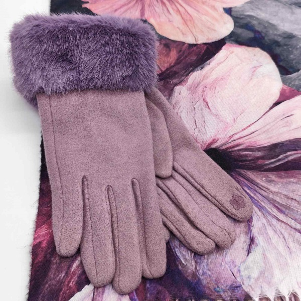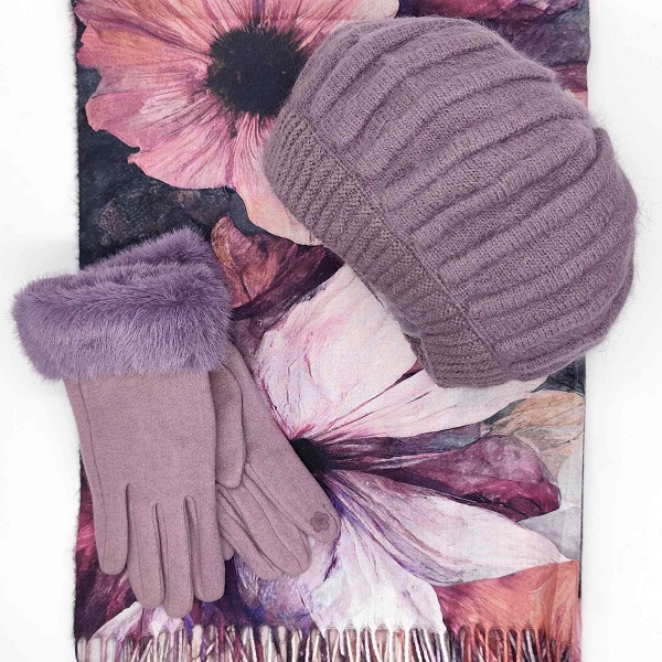 Дамски комплект – кашмирен шал с флорален мотив, барета и ръкавици в люляков цвят
