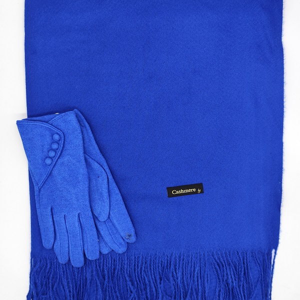 Кашмирен шал с ресни и ръкавици с копчета-Зимен комплект в турско синьо