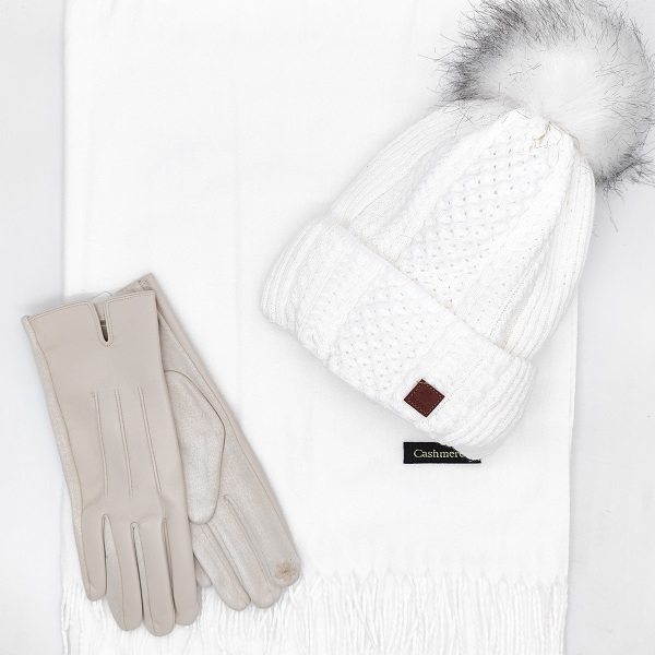 Шапка, шал и ръкавици в бяло-Дамски зимен комплект