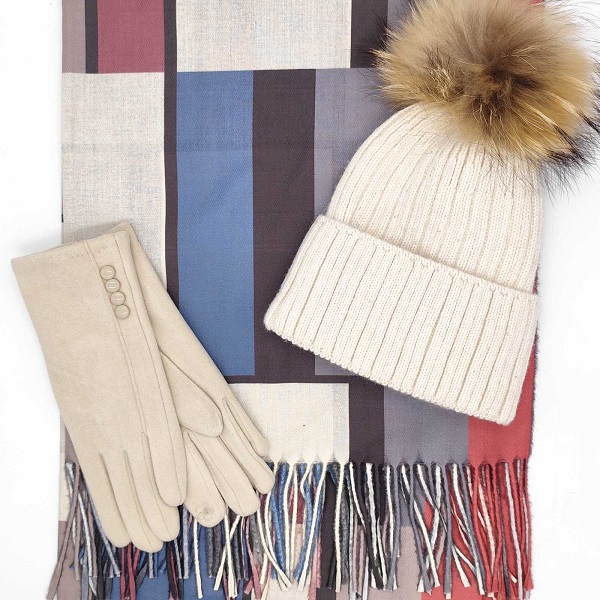 Дамски комплект – шапка с пух, кашмирен шал и ръкавици в бежов цвят