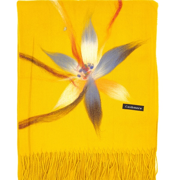 Дамски комплект в цвят горчица-Кашмирен шал с цвете, шапка и ръкавици
