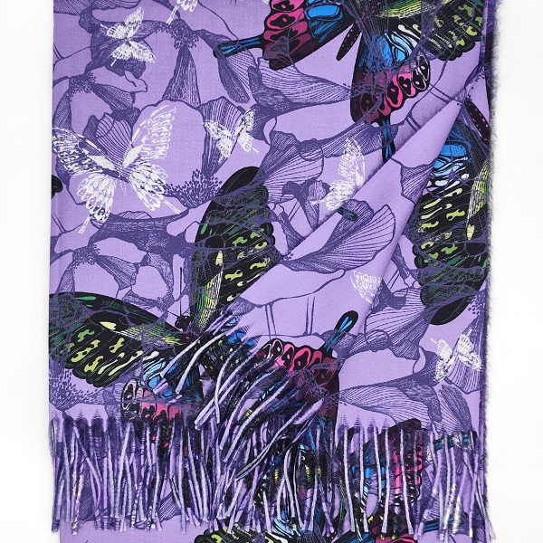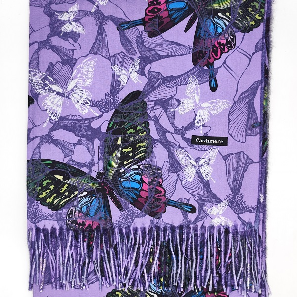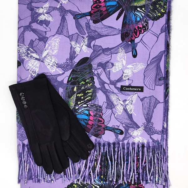 Лилавият кашмирен шал с красиви пеперуди носи усещане за женственост и стил, а черните ръкавици придават завършен изискан вид.
