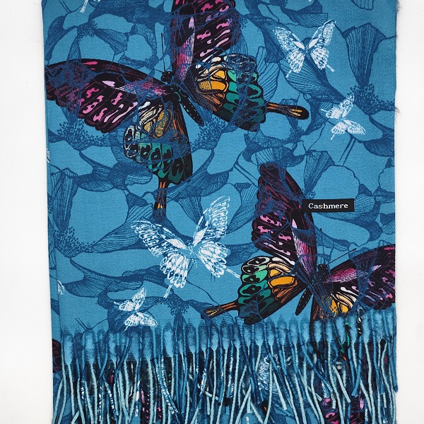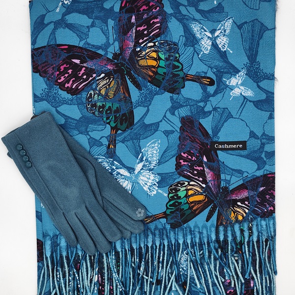 Комплект кашмирен шал с пеперуди и луксозни ръкавици в синята гама -Подарък за жена
