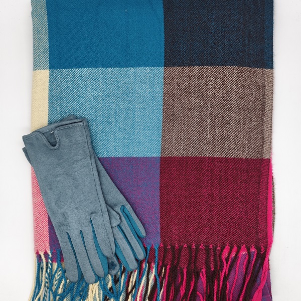 Комплект шал и ръкавици – пъстър кашмирен шал и сини ръкавици, коледен подарък за жена