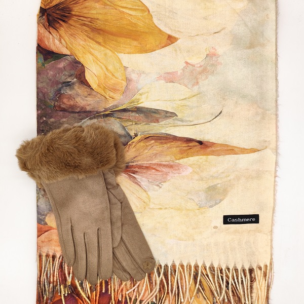 Луксозен Дамски комплект в бежово-Шал с цвете и ръкавици с естествен косъм