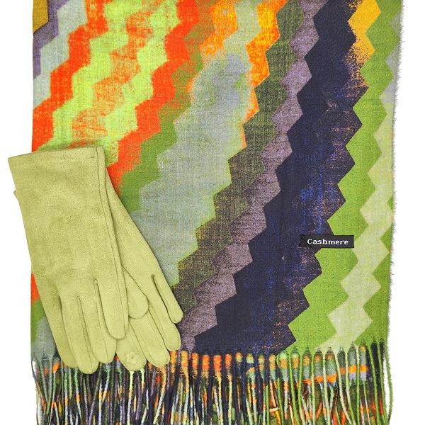 Стилен дамски зимен комплект – кашмирен шал с пъстър зигзагообразен десен и зелени ръкавици с елегантна визия. Подходящ избор за всяка дама, която обича да комбинира уют и цветен акцент през студените дни.