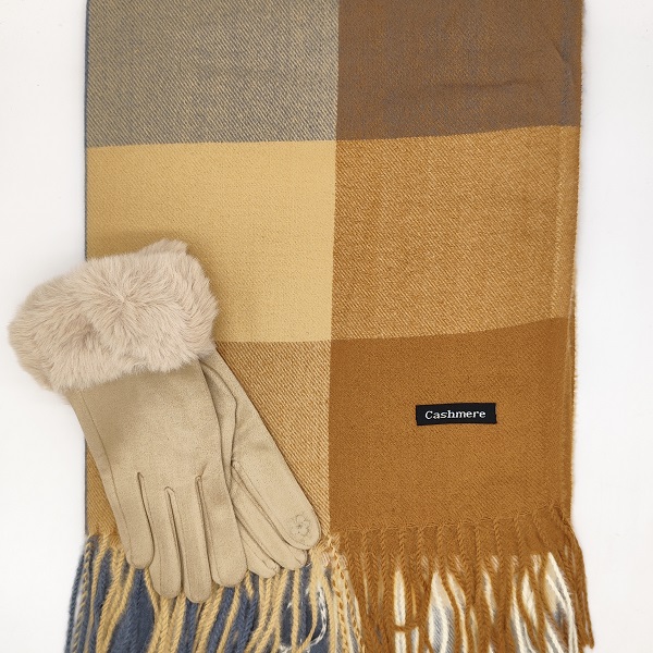Изискан и топъл комплект шал и ръкавици в бежово, който съчетава комфорт и стил в перфектна зимна комбинация. Подходящ за луксозен подарък за жена за Коледа, рожден ден или специален повод.