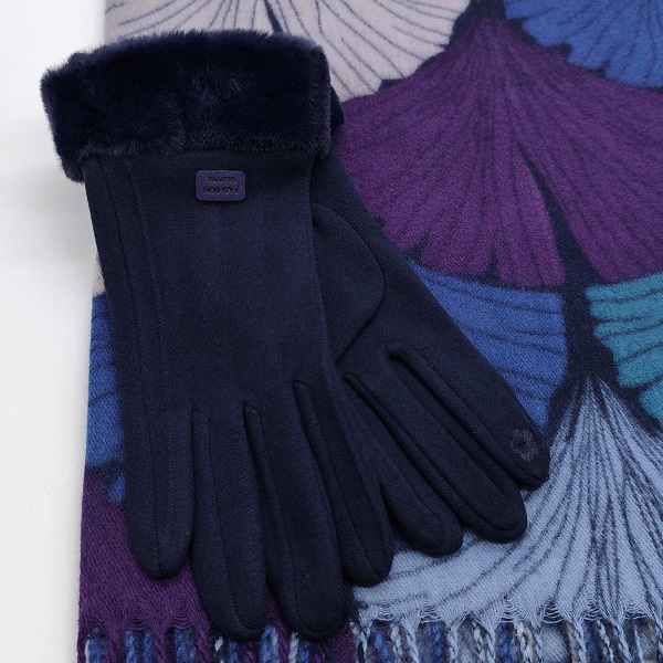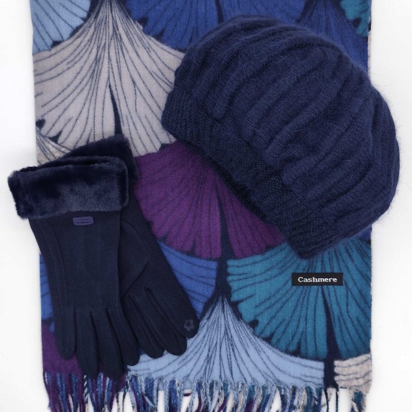 Шапка тип барета, шал, и ръкавици с пух в тъмно синьо-Дамски зимен комплект