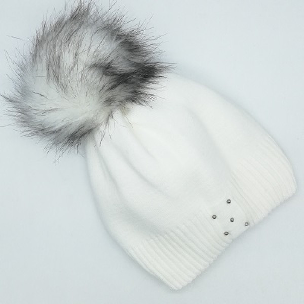 Снежно бяла зимна дамска шапка с помпон.
