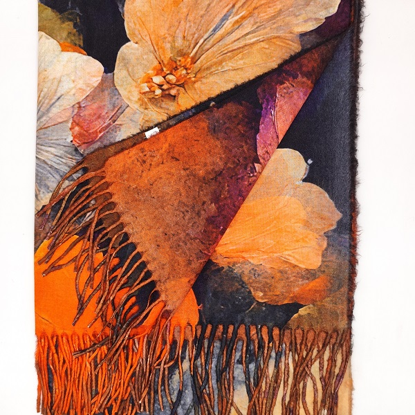 Впечатляващ дамски кашмирен шал с големи цветя в оранжево и бежово върху тъмносин фон. Комбинацията от дълбоки и топли цветове придава стил и изтънченост, а меката кашмирена материя осигурява комфорт и уют през студените дни. Фините ресни в долната част добавят движение и завършен елегантен акцент.