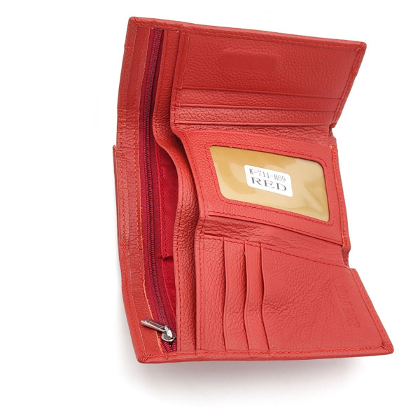 Практично и компактно дамско портмоне от естествена кожа в красив червен цвят, което съчетава удобство и функционалност в малък размер. Моделът е подходящ за ежедневна употреба и лесно се побира в дамска чанта или раница.