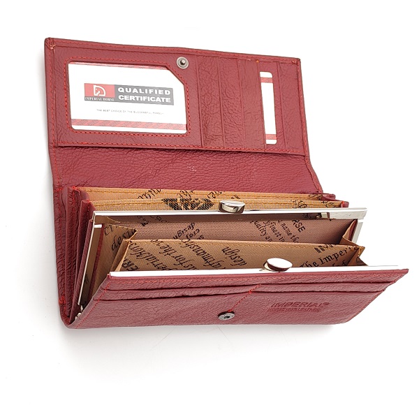 Дамско портмоне естествена кожа в стилен червен цвят, модел HORSE, който съчетава класическа визия и практично вътрешно разпределение. Изработен от 100% естествена кожа, този портфейл предлага издръжливост, мекота и стилен външен вид.