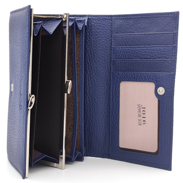 Елегантно дамско портмоне в наситен син цвят, изработено от висококачествена естествена кожа. Моделът е изключително практичен и функционален, подходящ за всяка дама, която търси стил и организация на вещите си.
