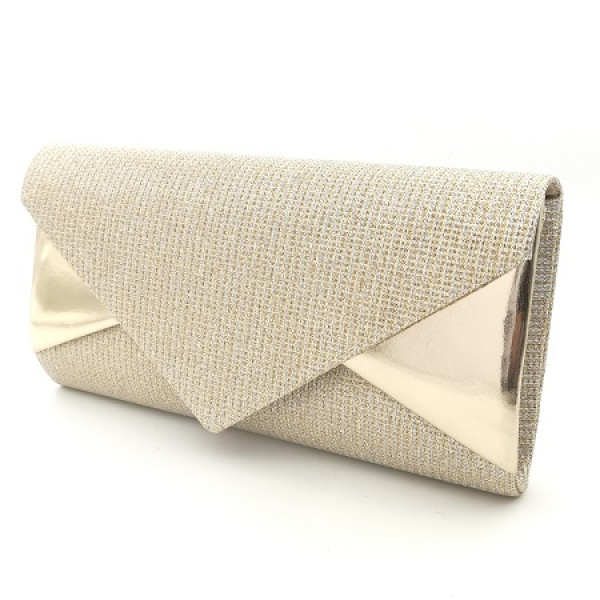 Дамска официална чанта клъч тип плик в златисто с брокат