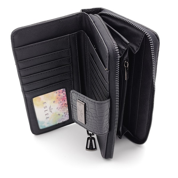 Стилен дамски портфейл с много прегради и отделения в черно