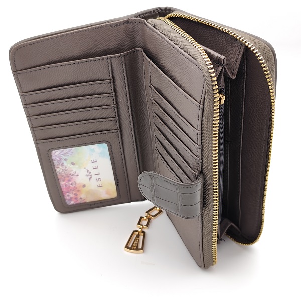 Дамско голямо луксозно портмоне в сив цвят от висококачествена еко кожа - Марка Eslee, нова колекция