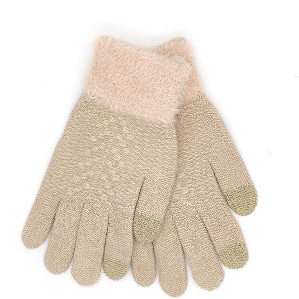 Меки и модерни дамски зимни ръкавици в бежов цвят с пухкав маншет в светлорозово. Изработени от топла, еластична материя, която осигурява комфорт и защита от студа. Дизайнът включва контрастни върхове на пръстите, които позволяват ползване на тъч скрийн устройства без да се свалят ръкавиците. Идеален избор за ежедневие, разходки и пътувания през зимата.
