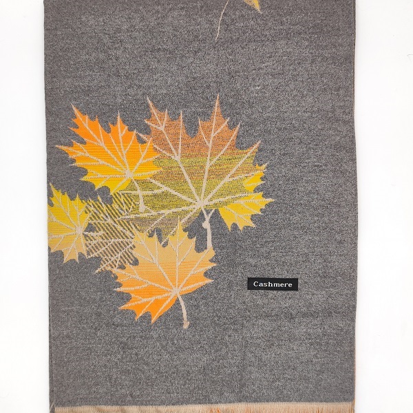Елегантен дамски кашмирен шал с изискан двулицев дизайн – от едната страна в стилно сиво, а от другата в топло оранжево с жълти акценти. Декориран с фини мотиви на есенни листа, този модел съчетава лукс, комфорт и стил в едно. Изработен от плътна и мека кашмирена материя, той осигурява отлична топлина и нежно усещане при допир с кожата.