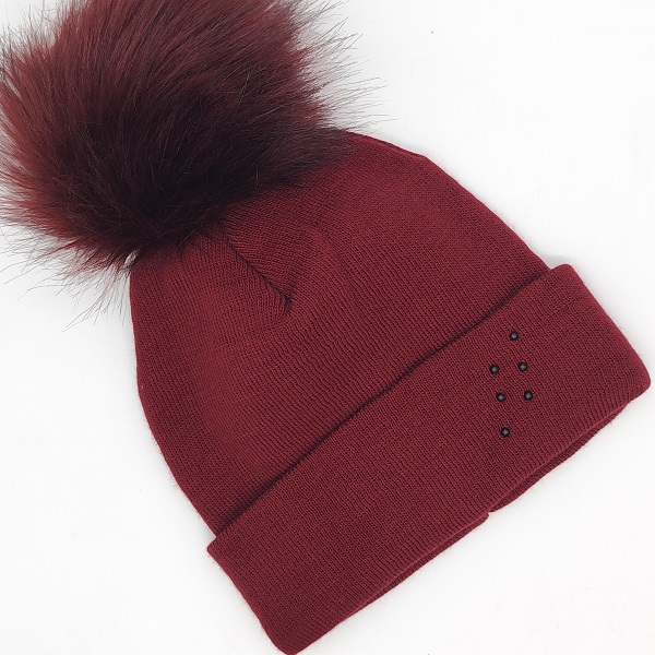 Дамска зимна шапка с пух и камъчета в бордо – българско производство