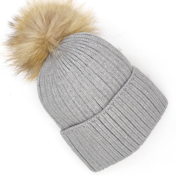 Дамска зимна шапка сива с подгъв и пух естествен косъм