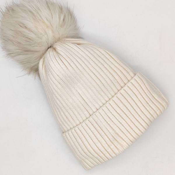 Дамска зимна шапка в бяло с подгъв и пух от естествен косъм