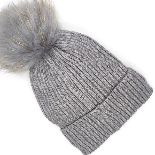 Дамска зимна шапка в сиво с подгъв и пух-Естествен косъм