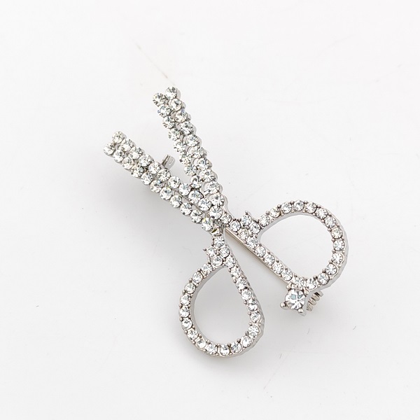 Уникална и впечатляваща брошка във форма на ножица, изработена със сребрист обков и украсена с множество блестящи кристали. Оригинален модел, който ще добави акцент и индивидуалност към вашата визия. Идеален аксесоар за хора с артистичен дух, фризьори, дизайнери или като нестандартен подарък за жена.